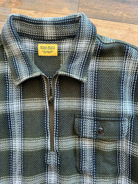 Men’s straight fit, straight tail collared half zip shirt with long sleeves, flap breast pocket and side seam hand warmer pockets.