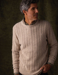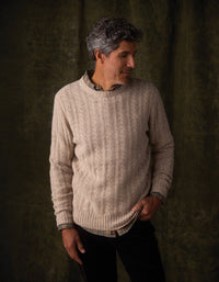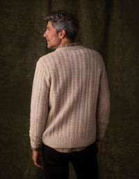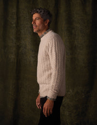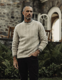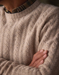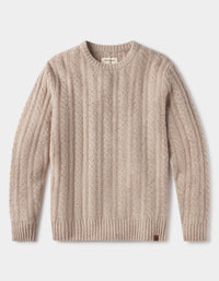 The Kennedy Cable Crew has that classic wool look with a natural texture that gives it extra character. It’s warm, timeless, and easy to wear—finished with all-over cableknit, rib edges, and their signature suede bear tag.