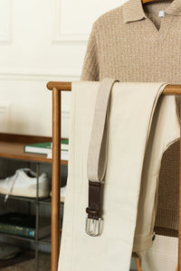 The Antibes Belt, woven in light grey. A hybrid smart belt that combines suede leather with an adjustable clasp for a perfect fit. Classic from the front, sporty-chic from behind.
