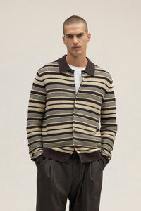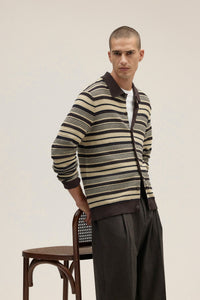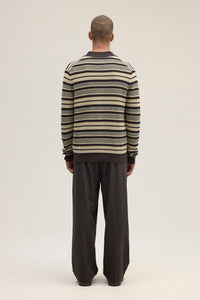 Regular fit long sleeve polo crafted from 100% organic cotton with a high-twist, textured stitch. Features a striped design and river shell buttons, adding an elegant touch.