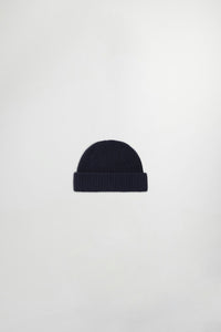 Ribbed beanie crafted in a half cardigan stitch certified wool yarn and complete with a double fold up.