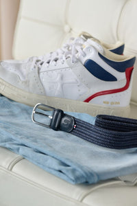 The Puglia belt, crafted from waxed cotton and braided in dark blue.